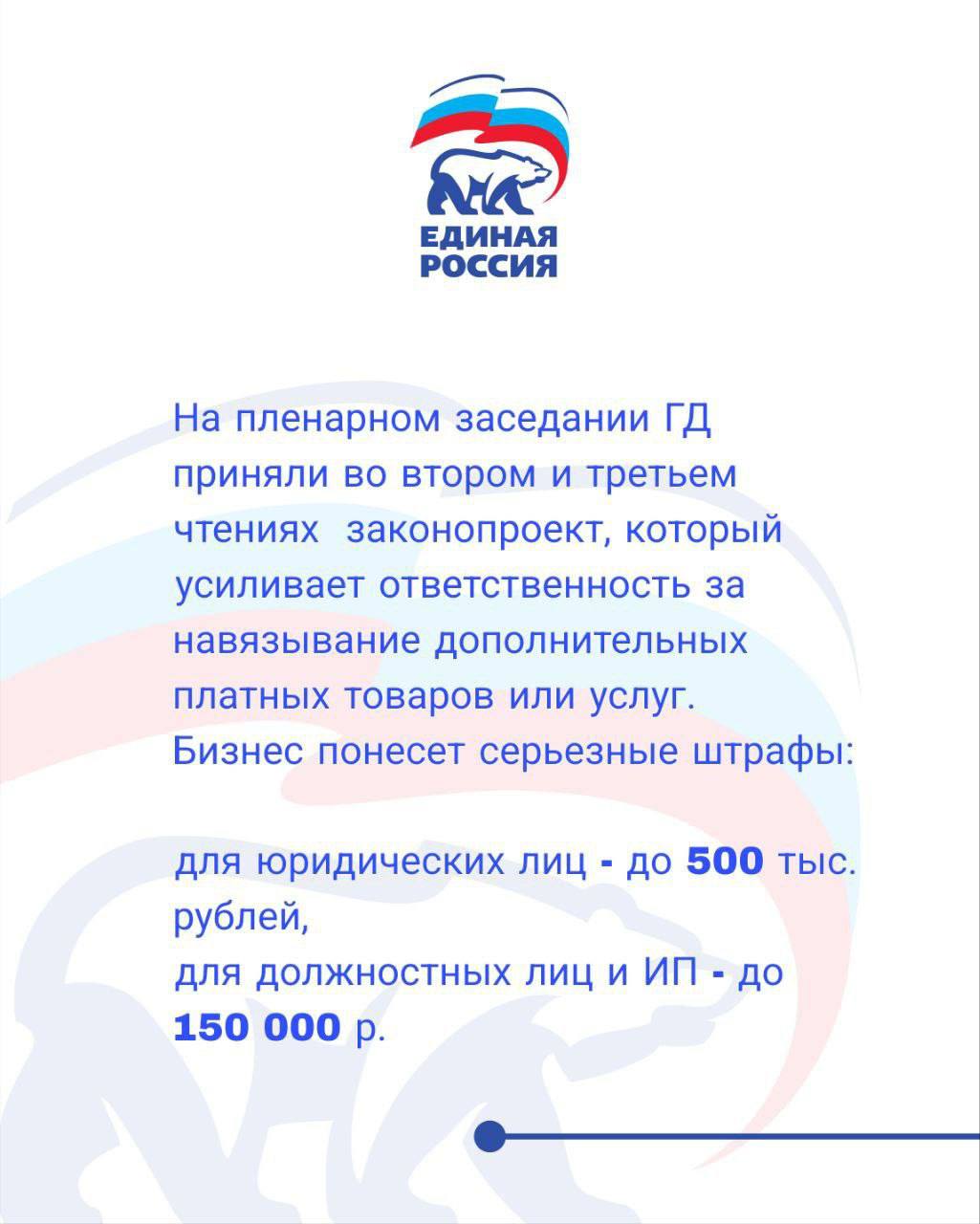 На пленарном заседании Госдумы приняли во втором и третьем чтениях законопроект, который усиливает ответственность за навязывание дополнительных платных товаров или услуг. Теперь за то, чтобы вам продавали страховку «в нагрузку» к кредиту или заставляли доплачивать за «нужные» места в самолете, бизнес понесет серьезные штрафы: для юридических лиц - до 500 тыс. рублей, для должностных лиц и ИП - до 150 000 р.