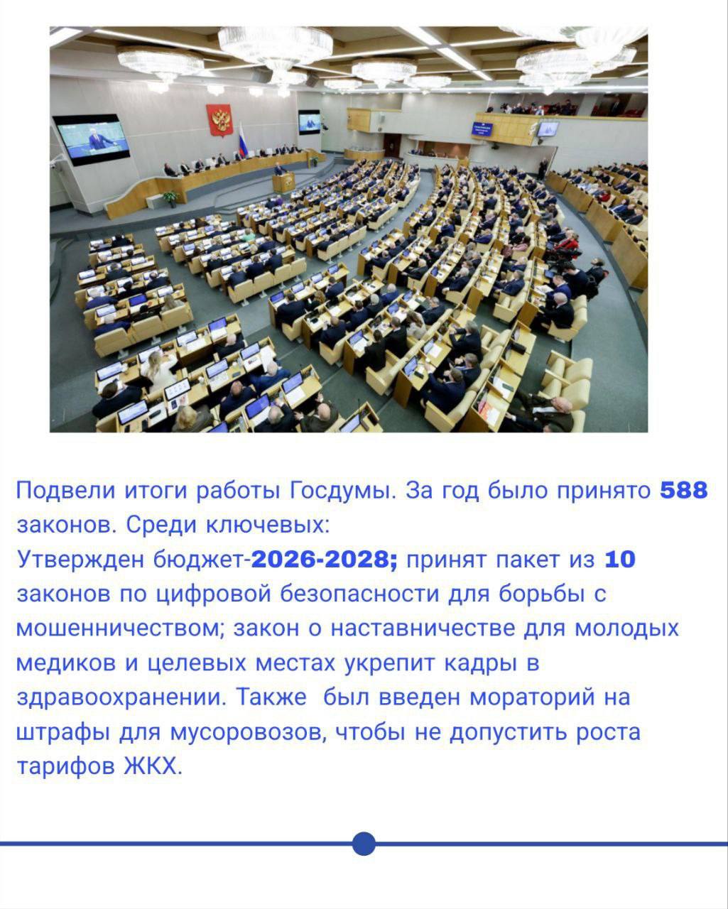 Подвели итоги работы Госдумы. За год было принято 588 законов. Среди ключевых: