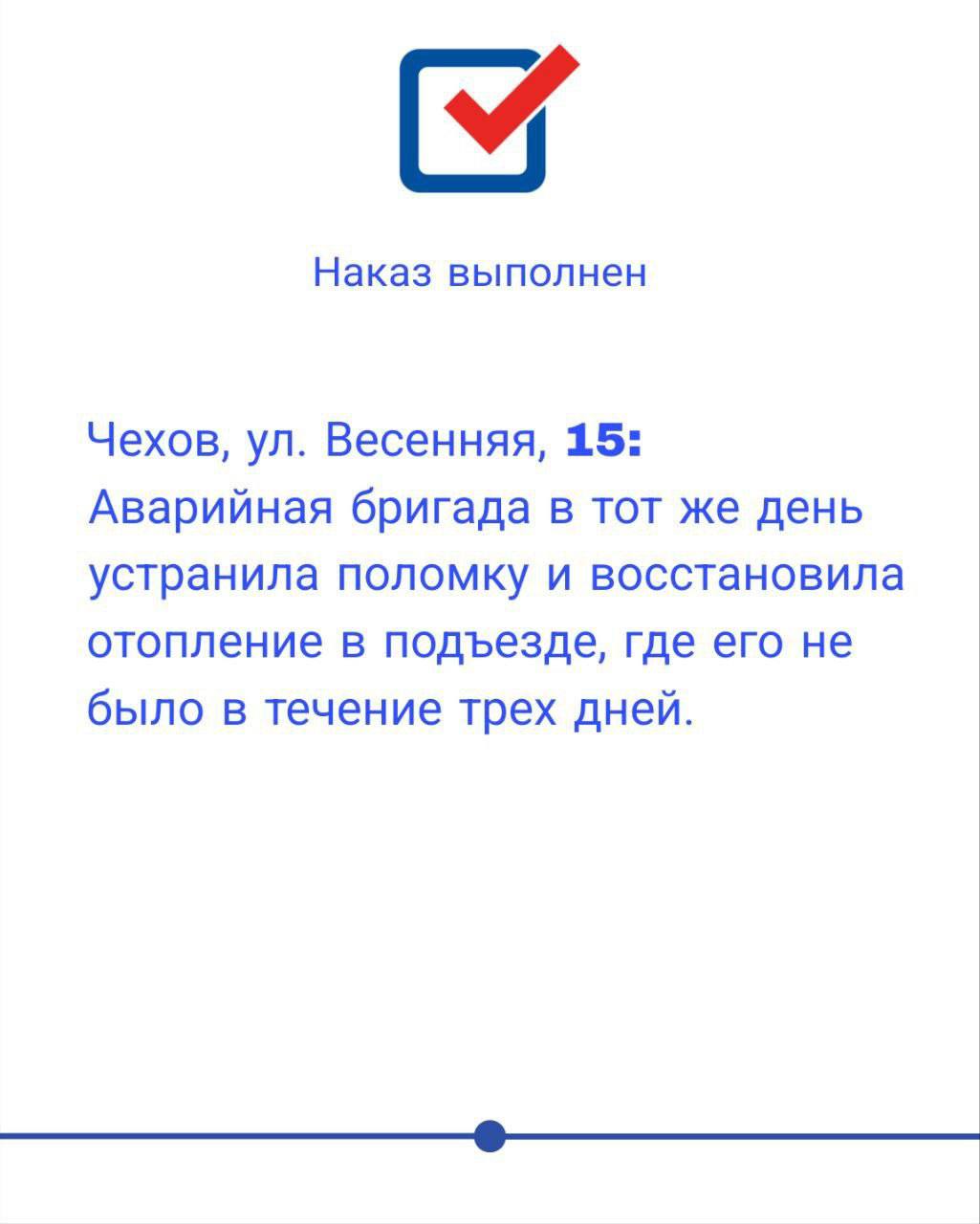Чехов, ул. Весенняя, 15: Аварийная бригада в тот же день устранила поломку и восстановила отопление в подъезде, где его не было в течение трех дней.