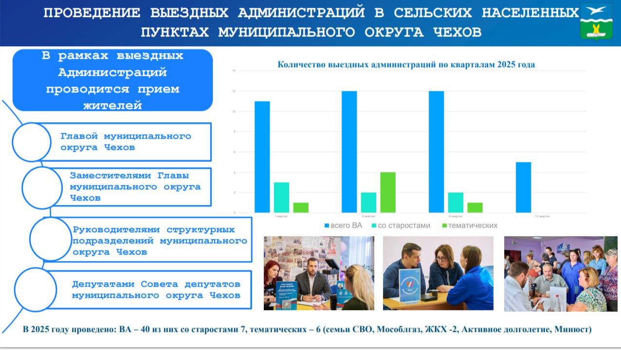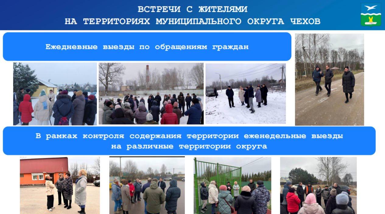 Одним из важных направлений работы Управления является проведение встреч с жителями. В формате «Выездных администраций» прием вели руководители Администрации, депутаты Совета депутатов м.о. Чехов, руководители структурных подразделений и смежных организаций. За год было проведено 40 встреч, включая 7 с участием старост и 6 тематических мероприятий. Это позволило наладить прямой контакт с жителями, обсудить актуальные вопросы и предложить решения проблем.