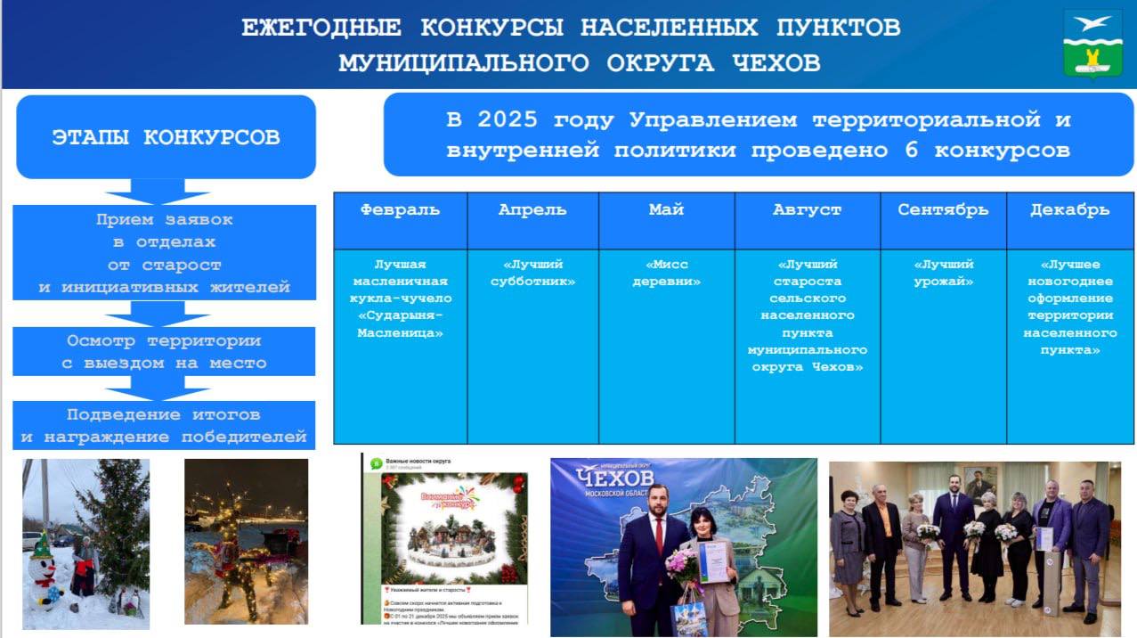 В 2025 году было проведено 6 ежегодных конкурсов, включая «Лучший староста» и «Лучшее новогоднее оформление». Сейчас завершается работа конкурсной комиссии по определению победителей в конкурсе на лучшее оформление населенного пункта и домовладения.