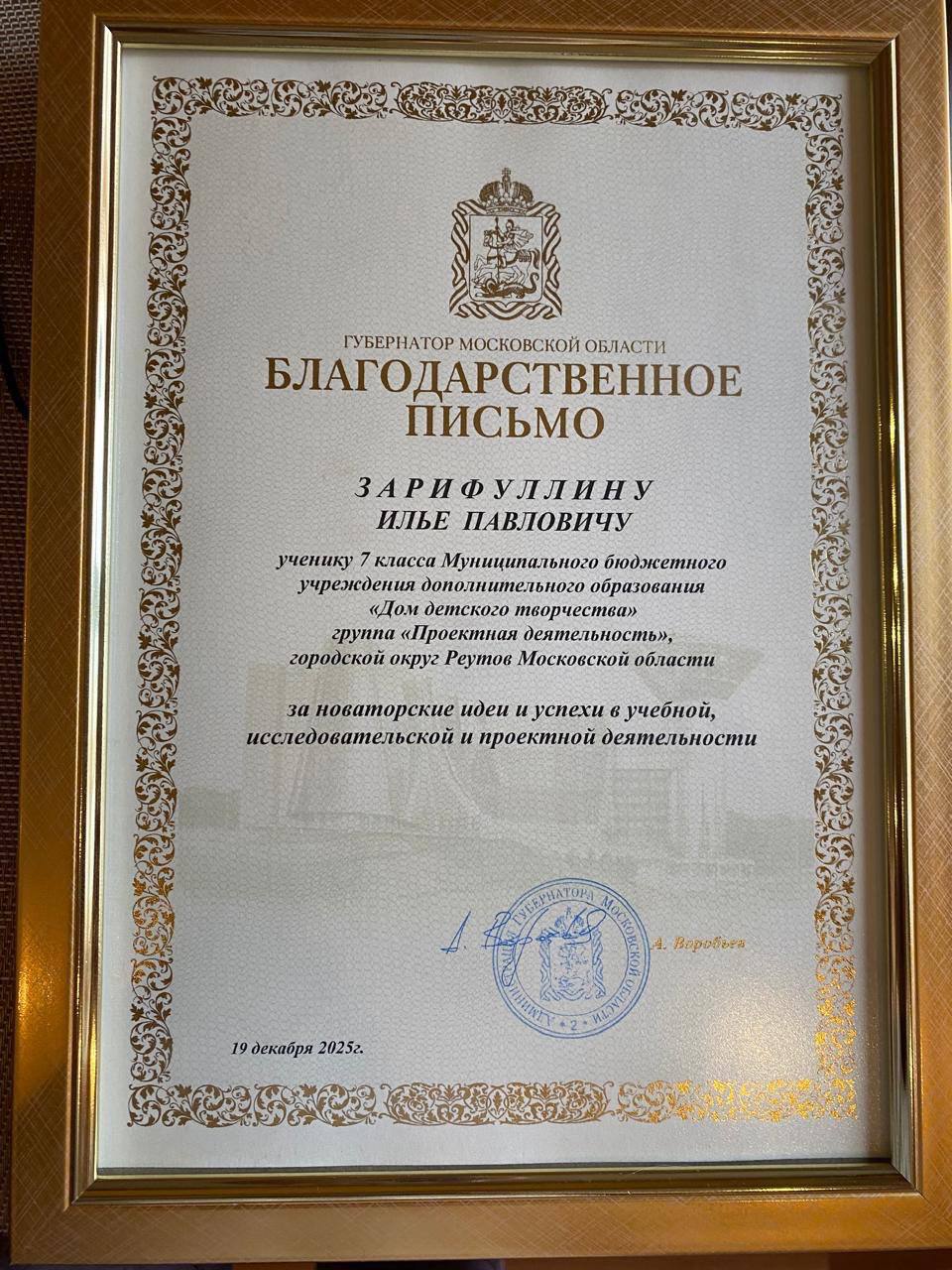 Воспитанник детского технопарка «Изобретариум» из Реутова, Илья Зарифуллин, был удостоен высокой награды — благодарственного письма Губернатора Московской области Андрея Воробьева. Торжественная церемония награждения состоялась в Доме Правительства Московской области 30 декабря в рамках ежегодной региональной премии «Гордость Подмосковья», которая отмечает выдающиеся достижения талантливых детей, а также многодетные и приемные семьи региона.