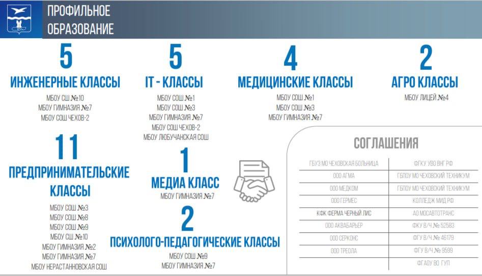 В школах Чехова реализуются региональные проекты, среди которых «Школа полного дня», «Эффективная начальная школа», «Комфортная школа», «Образовательный комплекс», а также цифровые классы и проекты, связанные с искусственным интеллектом. Кроме этого функционируют 45 математических классов. В части профильного образования, в школа округа созданы инженерные, медицинские, предпринимательские, IT, агро-, психолого-педагогические и медиа-классы.