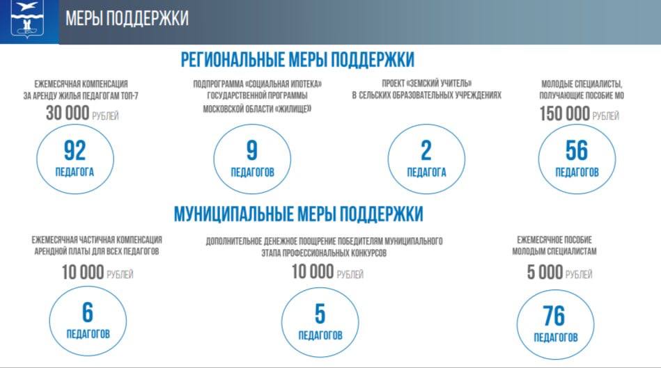 Для поддержки педагогов предусмотрен ряд региональных и муниципальных мер поддержки. Ежемесячную компенсацию за аренду жилья от региона получают 92 учителя. В подпрограмме «Социальная ипотека» госпрограммы Московской области «Жилище» участвуют 9 педагогов, а в проекте «Земский учитель» - 2 педагога сельских образовательных учреждений. Среди муниципальных мер поддержки – ежемесячная частичная компенсация арендной платы, которую получают 6 педагогов; дополнительное денежное поощрение 5 победителям муниципального этапа профессиональных конкурсов; ежемесячное пособие получают 76 молодых специалистов.