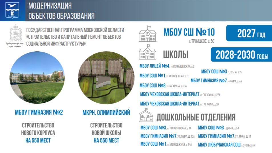 По программе «Строительство и капитальный ремонт объектов социальной инфраструктуры» в 2025 году завершено строительство пристройки к школе №3 – это позволило полностью ликвидировать обучение во вторую смену в данном учебном заведении. В 2026-27 году запланировано строительство нового корпуса гимназии №2. Помимо этого, в следующие несколько лет пройдет масштабная модернизация объектов образования по госпрограмме «Строительство и капитальный ремонт объектов социальной инфраструктуры»: капитальный ремонт старого корпуса гимназии №2, строительство новой школы на 550 мест в микрорайоне «Олимпийский», а также ремонт ряда школ и дошкольных учреждений м.о. Чехов.