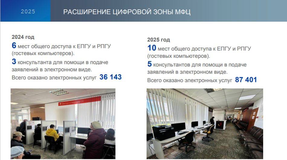 В рамках расширения цифровой зоны МФЦ организовано 10 мест общего доступа к порталам ЕПГУ и РПГУ с гостевыми компьютерами, а также работает 5 консультантов, помогающих в электронной подаче заявлений. Всего в 2025 году была оказана 87 401 электронная услуга.