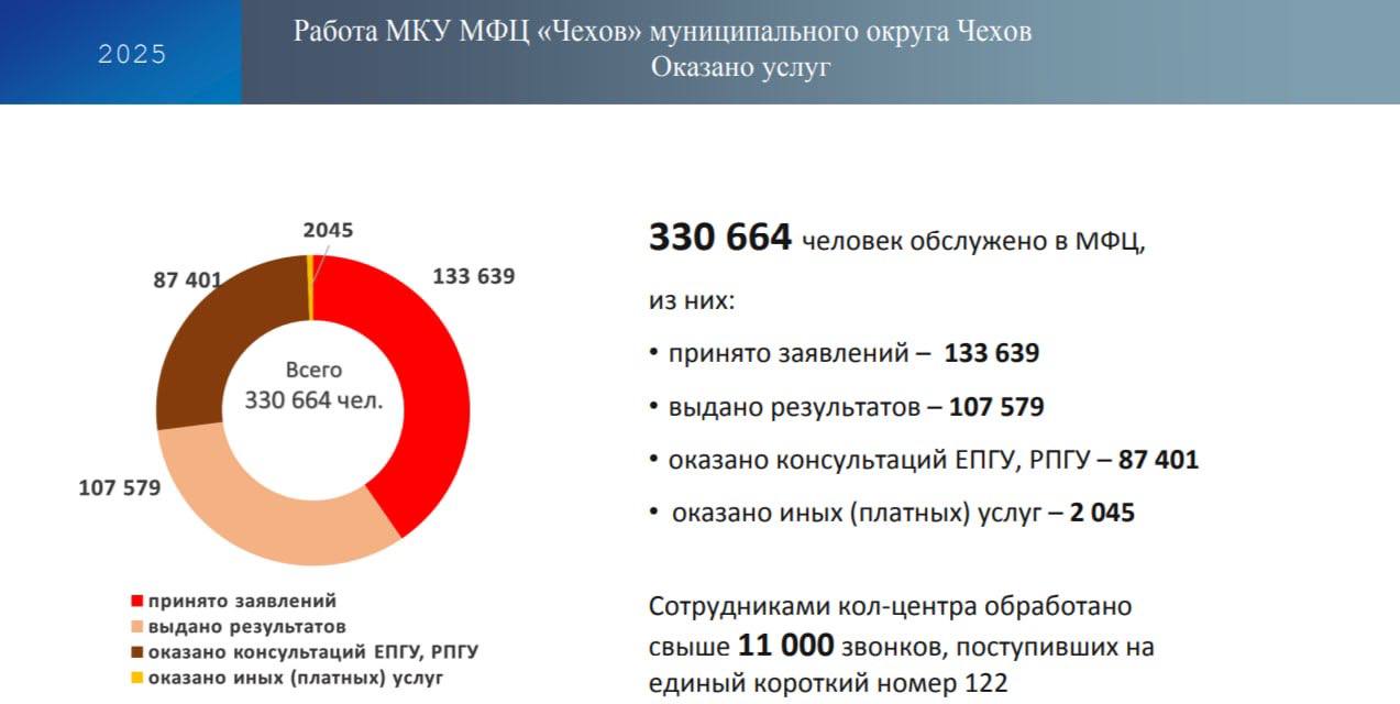 За год в МФЦ муниципального округа Чехов было принято свыше 330 тысяч человек и 133 639 заявлений, выдано 107 579 результатов, оказана 87 401 консультация по единому и региональному порталу государственных услуг, а также 2 045 иных платных услуг. Сотрудниками колл-центра обработано свыше 11 000 звонков, поступивших на единый короткий номер 122.