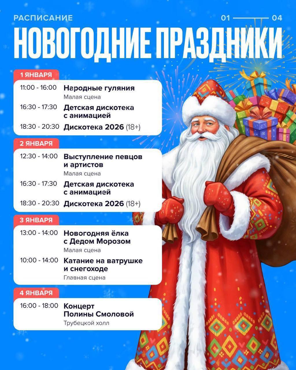 Активные игры, анимация и любимые зимние персонажи.