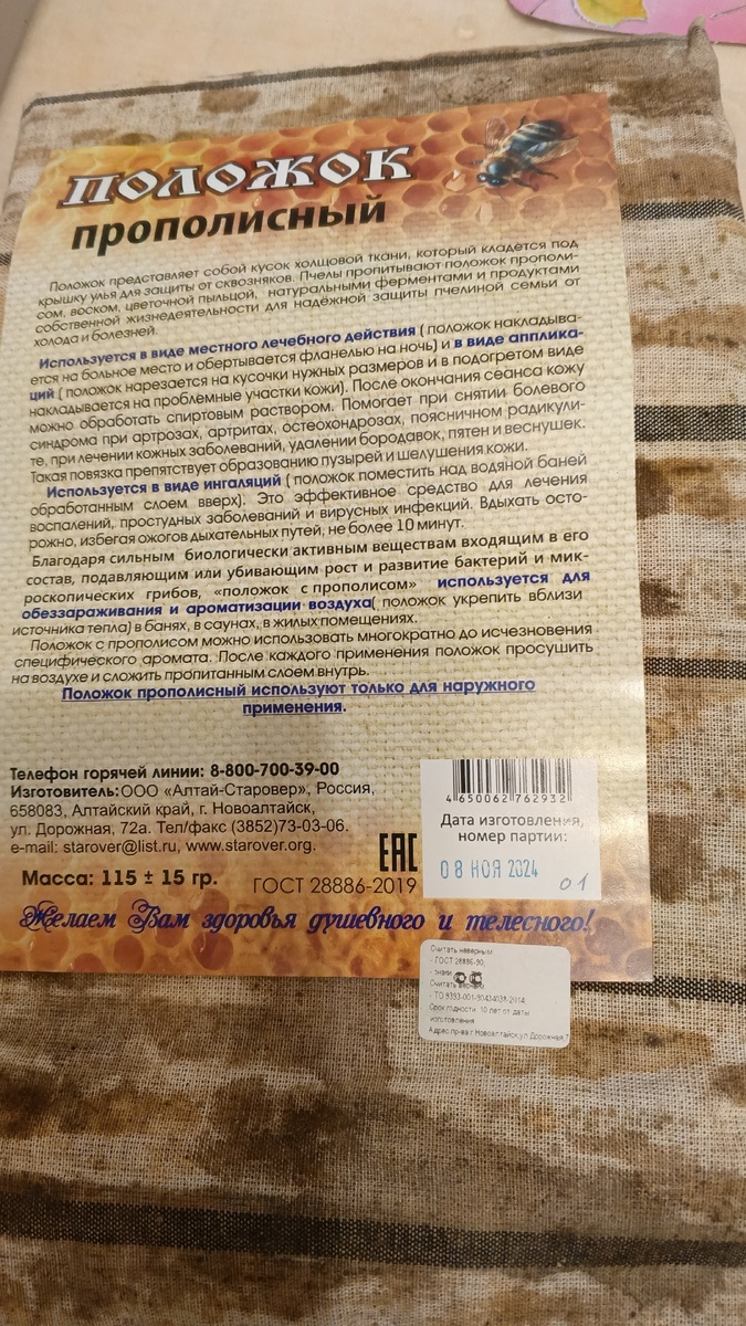 Прополисный положок — это кусок ткани, интенсивно пропитанный натуральным пчелиным прополисом. По своему виду он напоминает холст, который выделяет насыщенный медово-смолистый аромат. С каждым новым использованием он становится все более популярным, особенно среди тех, кто ищет альтернативу обычным мазям и настойкам. Продавцы в магазинах пчеловодства часто отмечают, что данный продукт применяется не только для стоп, но и для суставов, а также при радикулите.