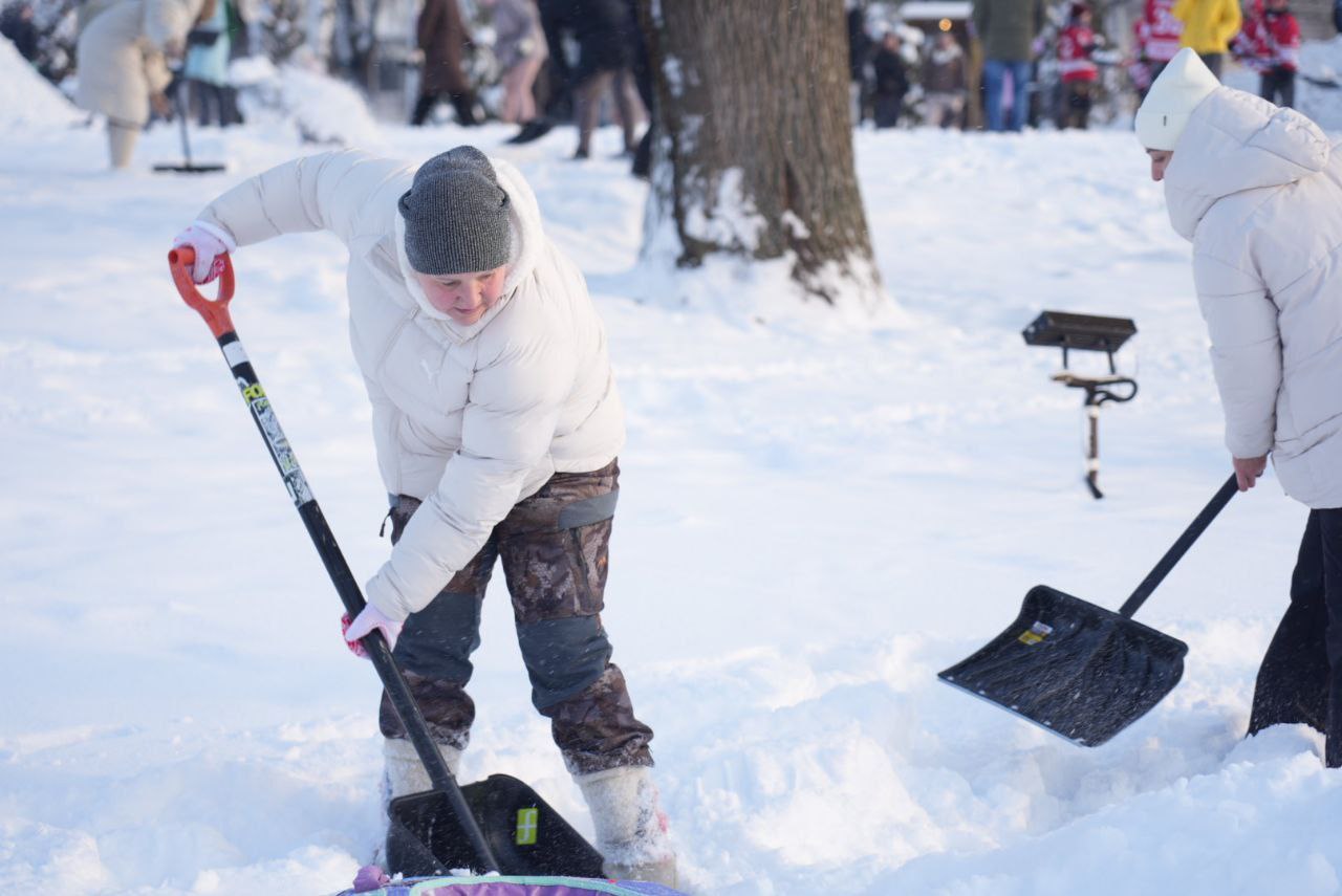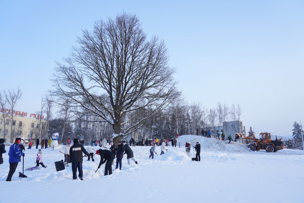 Люди пришли провести выходной на свежем воздухе целыми семьями. Кроме горок слепили из снега черепаху, Чебурашку, кокошник и другие фигуры.