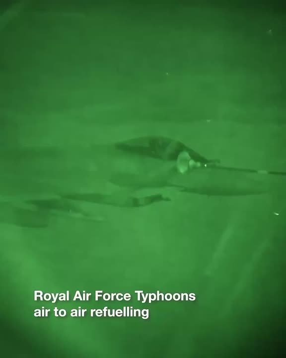На видео, опубликованном министерством обороны Великобритании, видно, как самолет-заправщик Voyager KC2 заправляет пару истребителей Eurofighter Typhoon FGR4 Королевских ВВС во время совместного с Францией удара по ИГИЛ в Сирии