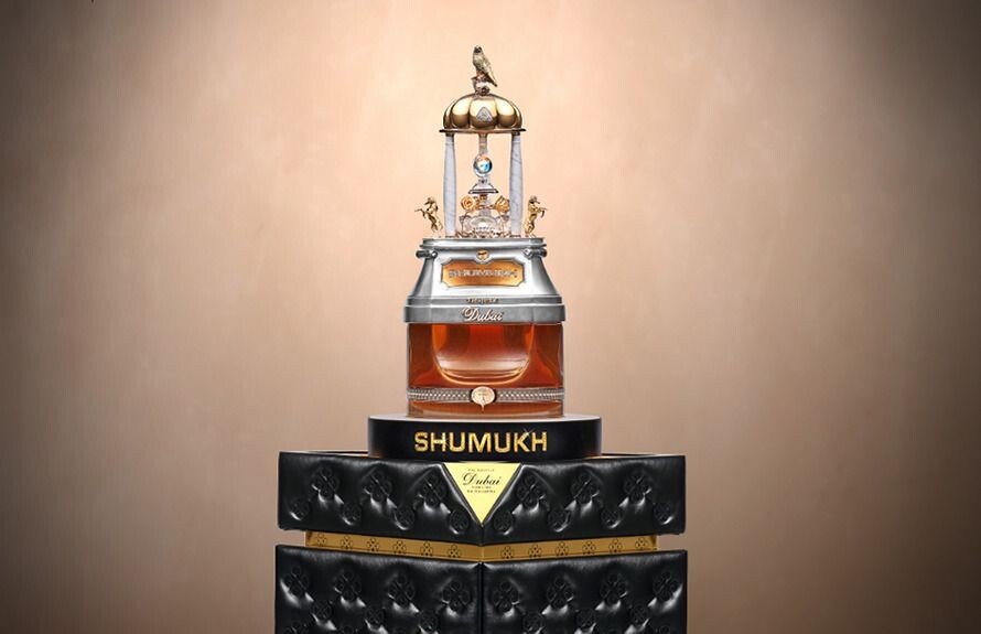 Флакон, выполненный с королевским размахом, включает более 2 килограммов 18-каратного золота, около 6 килограммов серебра и 3571 бриллиант, общий вес которых составляет 39 карат. Дополняют эту коллекцию топазы и жемчуг. Неудивительно, что Shumukh попал в Книгу рекордов Гиннесса как парфюм, обладающий наибольшим количеством бриллиантов.