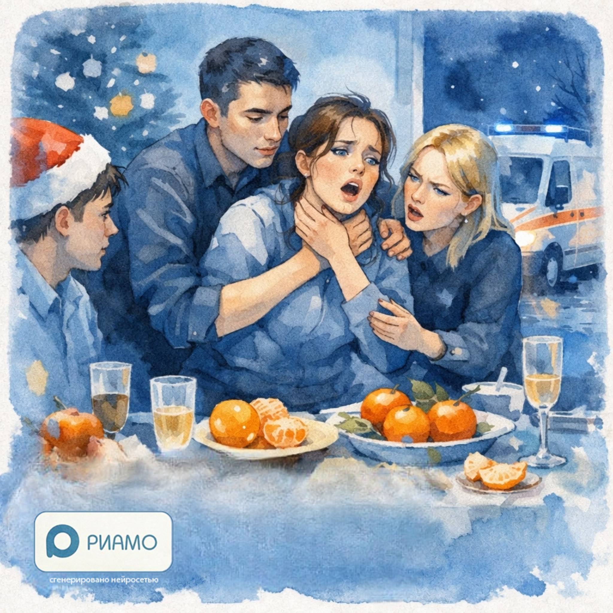 На новогоднем застолье друзья предложили девушке челлендж — съесть мандарин целиком. Во время спора она начала задыхаться.