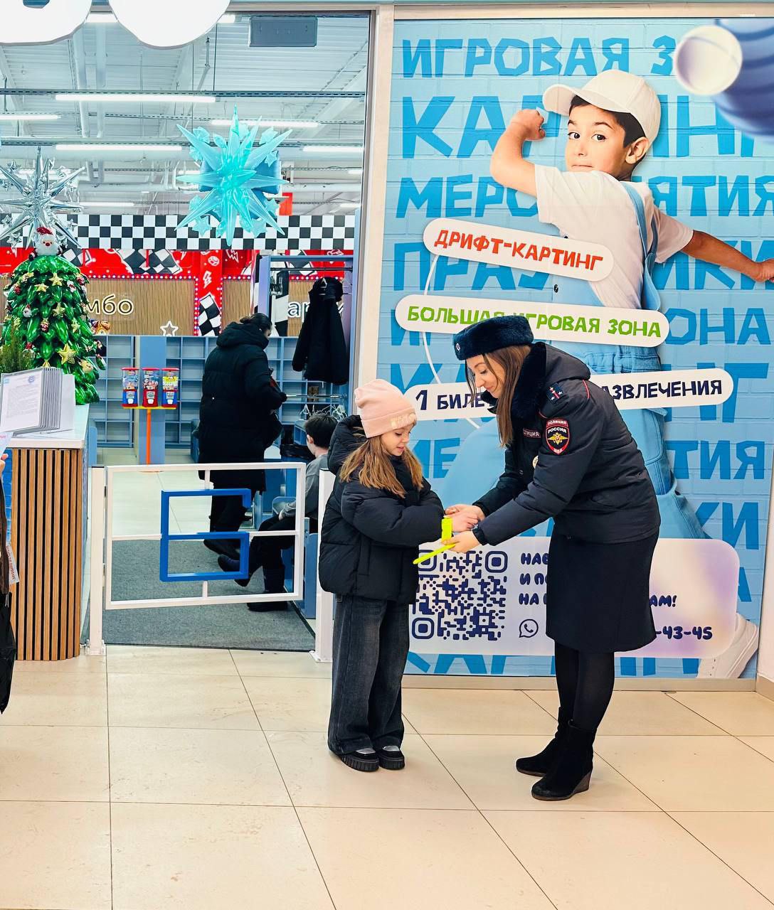 В рамках комплексного мероприятия «Зимние каникулы» полицейские напомнили посетителям торгово-развлекательных центров и детских игровых пространств о важности ношения световозвращающих элементов на верхней одежде в вечернее время суток и в условиях недостаточной видимости.