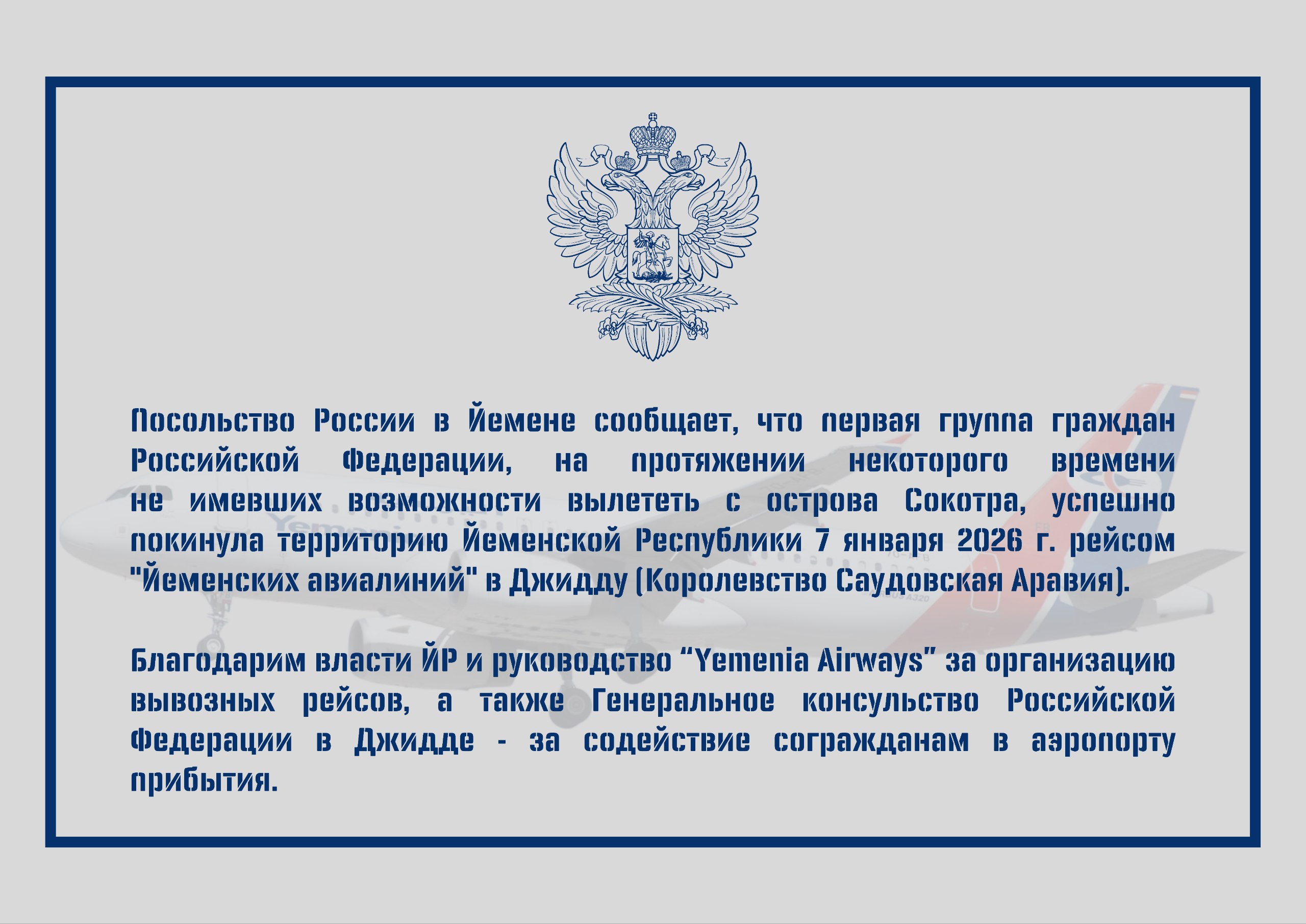 что первая группа граждан Российской Федерации, на протяжении некоторого времени не имевших возможности вылететь с острова Сокотра, успешно покинула территорию Йеменской Республики 7 января 2026 г. рейсом "Йеменских авиалиний" в Джидду (Королевство Саудовская Аравия).