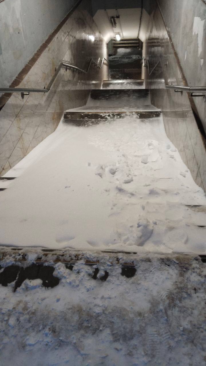 Тем временем в сети делятся фото лестниц у входа в столичное метро — их продолжает заметать.