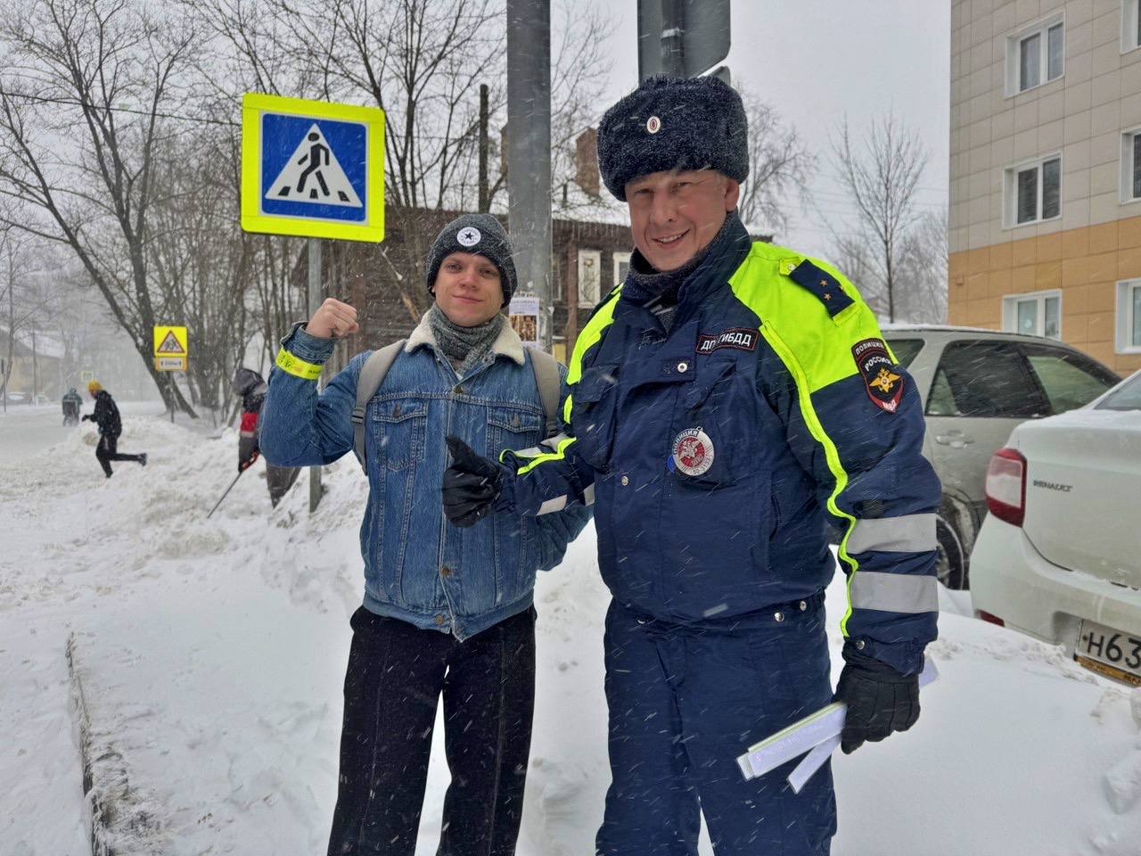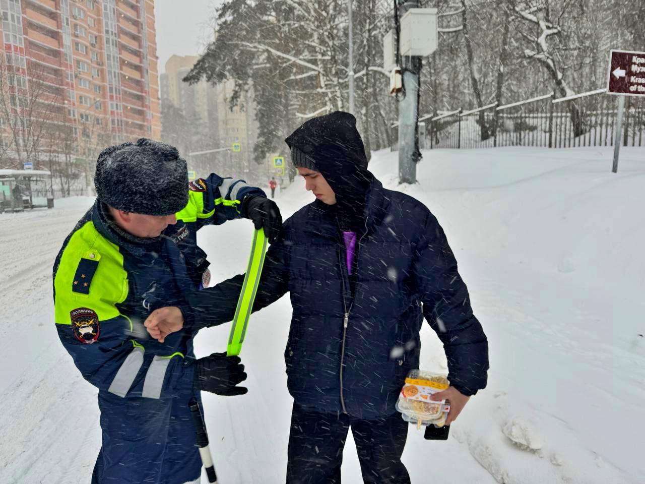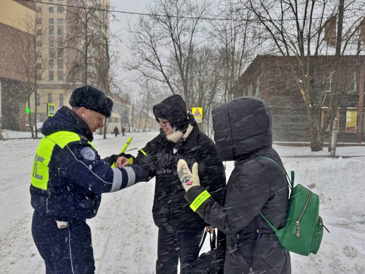 Пешеходам вручают СВЭ-элементы. В условиях метели это не просто аксессуар, а реальный шанс быть вовремя замеченным на дороге. Берегите себя!