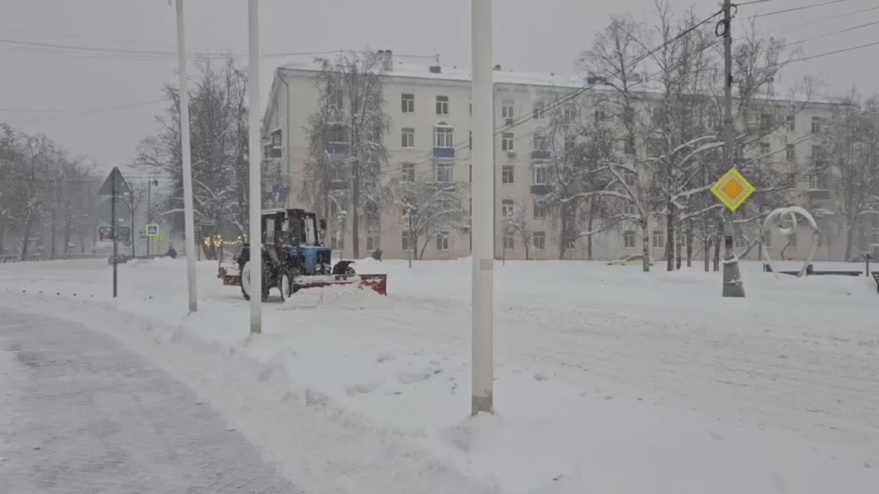 Сотрудники с помощью специализированной техники расчищают для свободного прохода пешеходов центральную площадь города и проезжую часть.