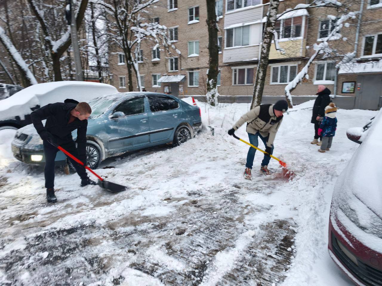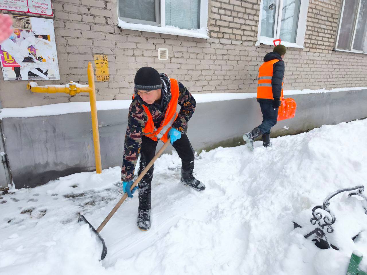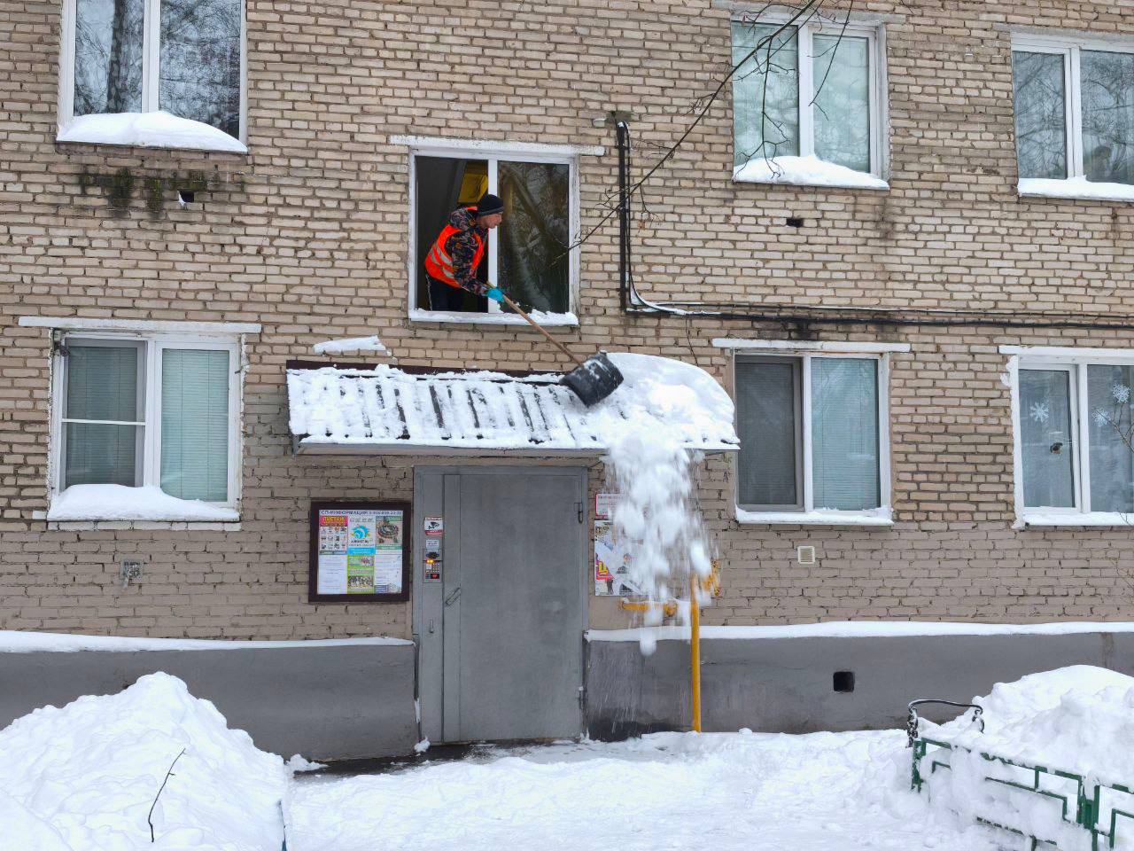 Управляющая компания также присоединилась, направив работников для очистки навесных конструкций.
