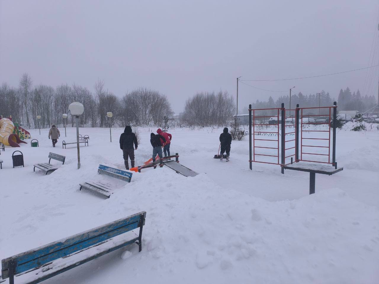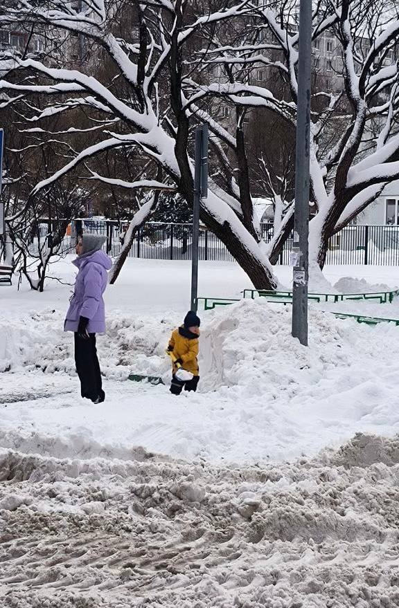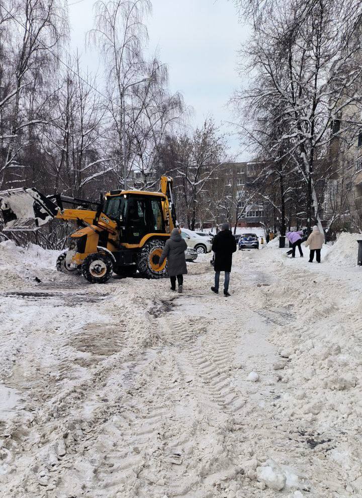 Жители округа помогают коммунальным службам справиться с последствиями непогоды. На фото — один из дворов на Талсинской улице. Как взрослые, так и дети вышли на уборку снега.