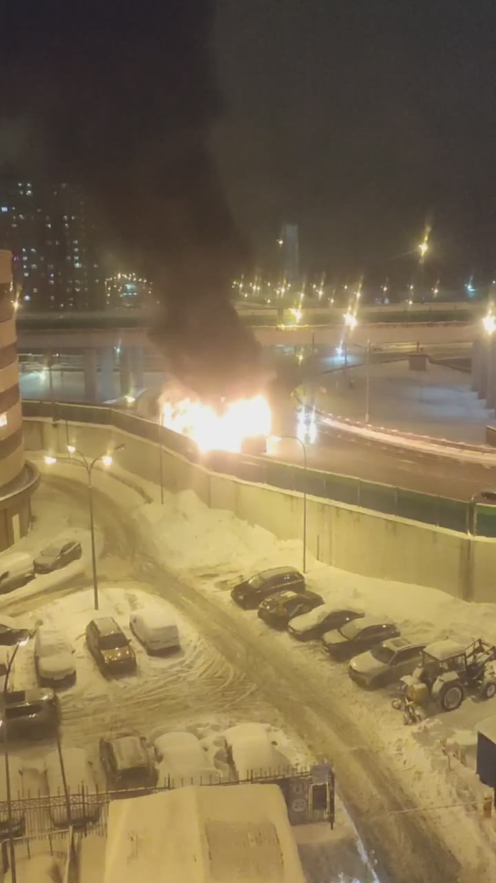 Автобус охватило сильное пламя — огонь быстро распространился по всему салону. Над местом происшествия поднимался густой черный дым. Момент сняли очевидцы.