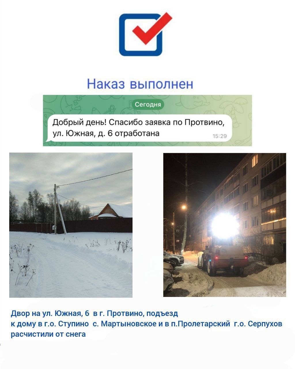Расчищены подъезды к домам в г. Протвино (ул. Южная) и п. Пролетарский (ул. Школьная).
