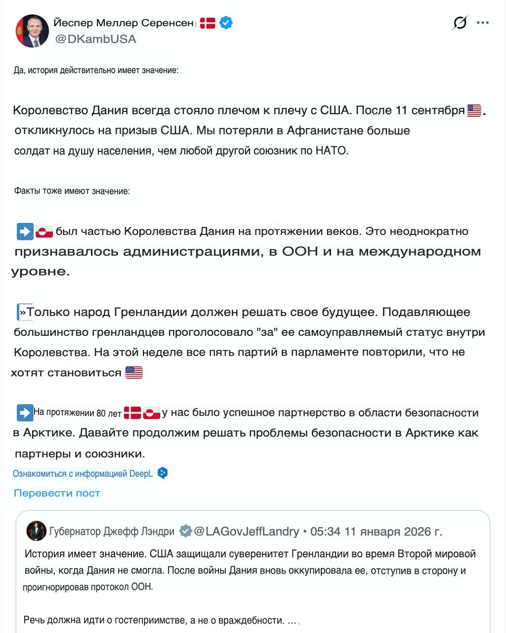 Датский посол в США Йеспер Меллер ответил на обвинение в «оккупации» Гренландии, призвав Штаты «решать проблемы безопасности в Арктике как партнеры и союзники».