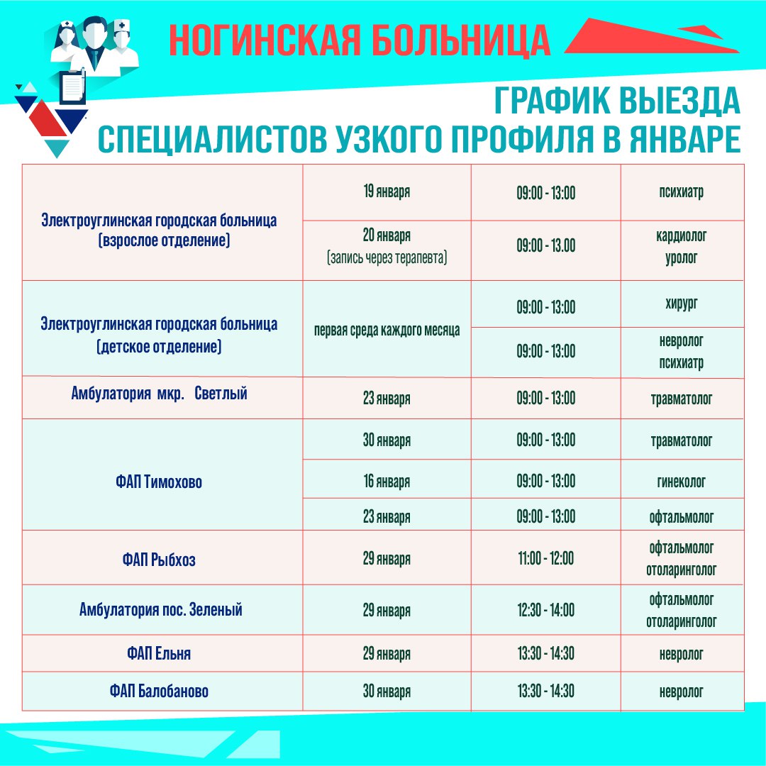 График работы специалистов узкого профиля Ногинской больницы в населенных пунктах Богородского округа в январе