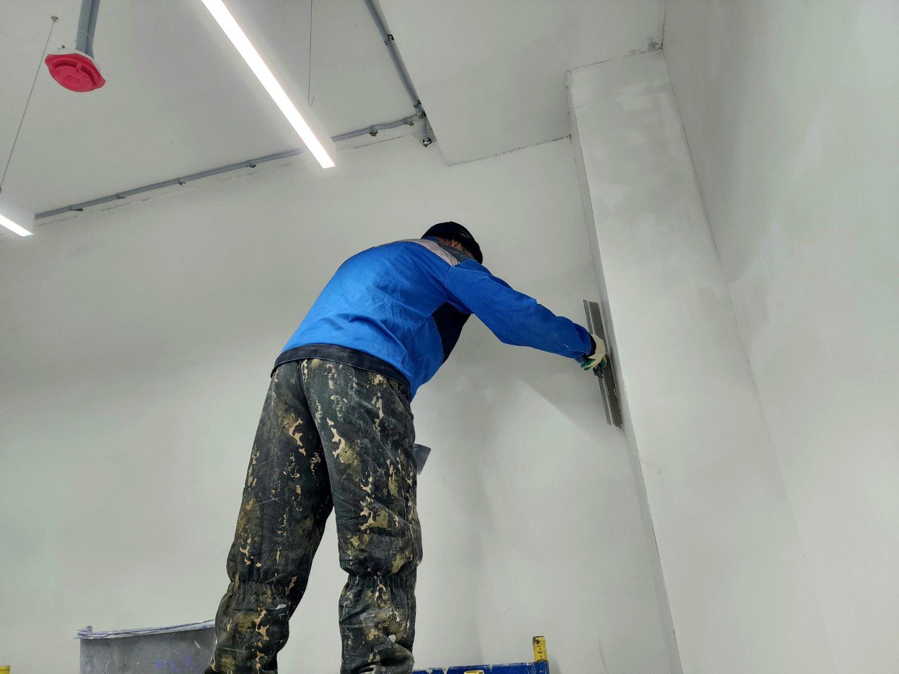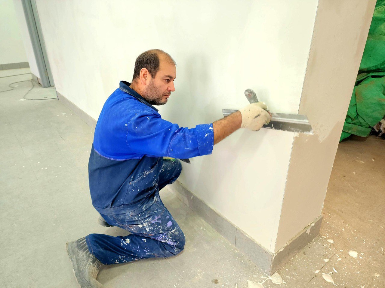 в спортзале и актовом зале подходят к концу штукатурные работы.