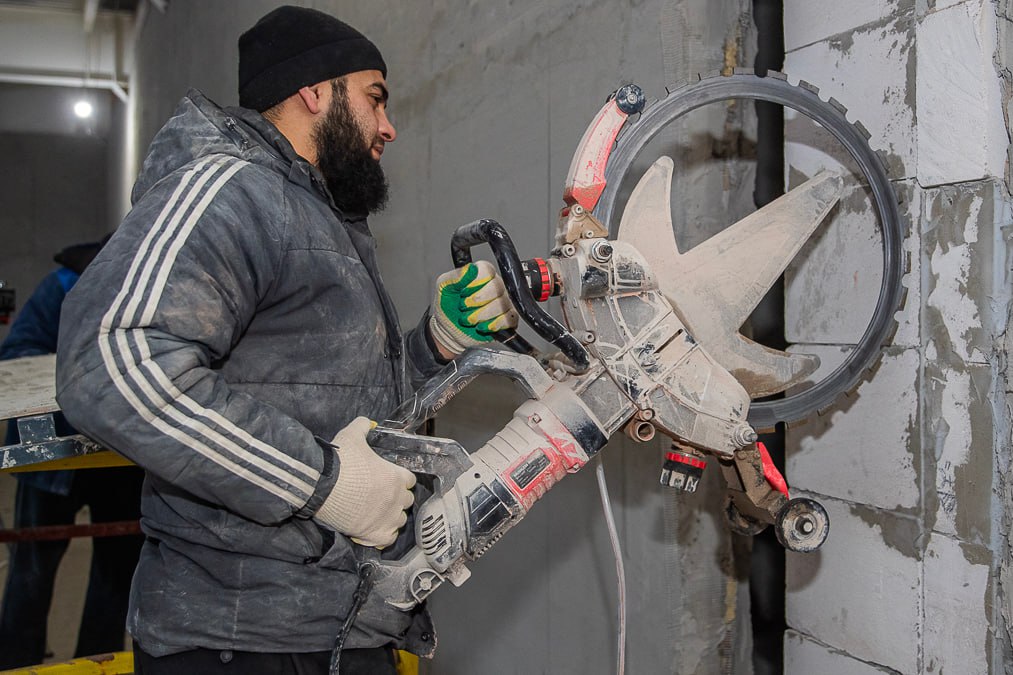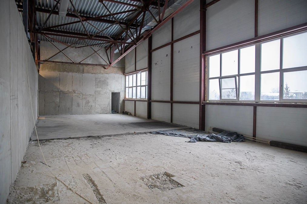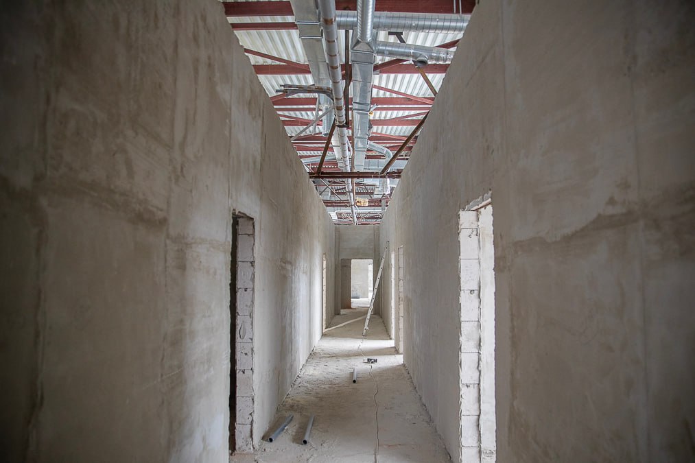 Демонтажные работы уже завершены, сделаны внутренние перегородки из газобетонных блоков, сейчас строители штукатурят внутренние стены — задача выполнена на 80%. Параллельно подрядчик делает бытовую канализацию, а на территории вокруг здания рабочие убирают строительный мусор.