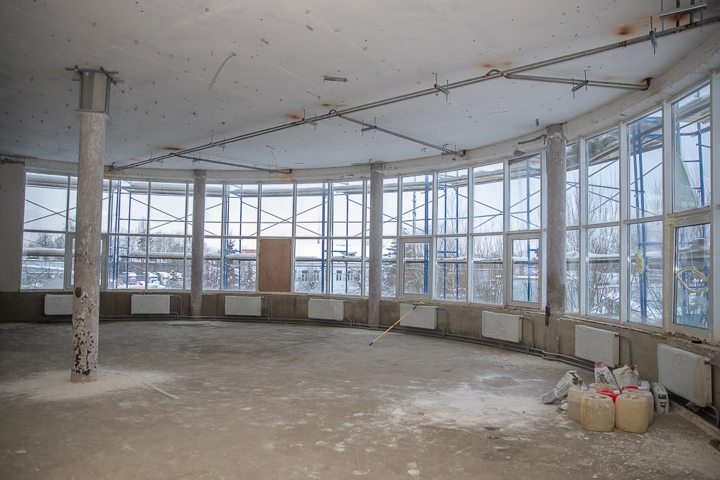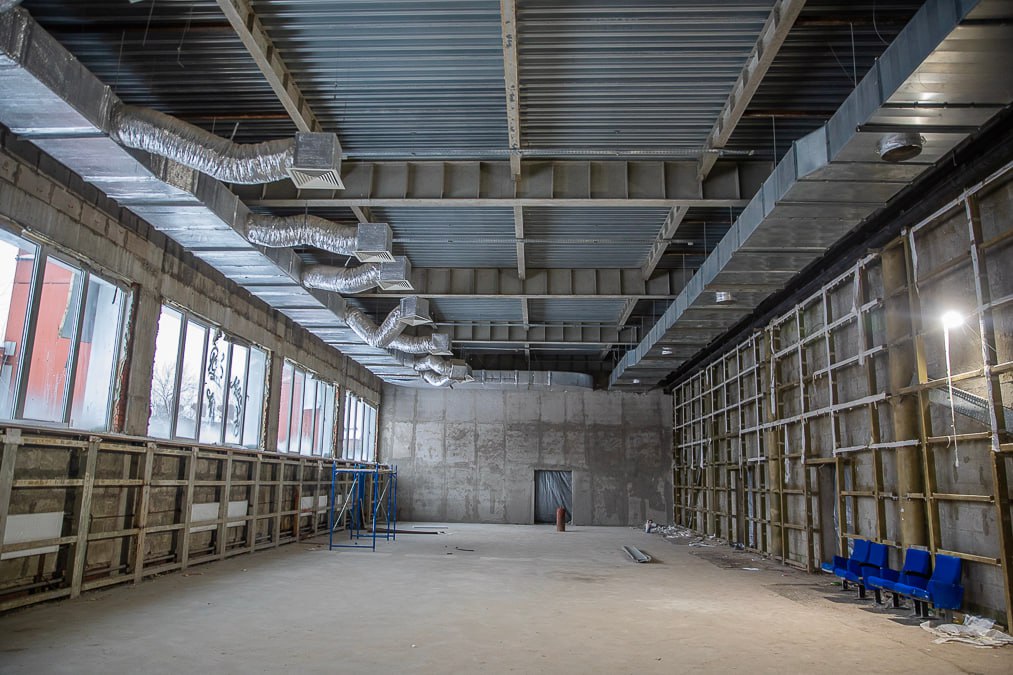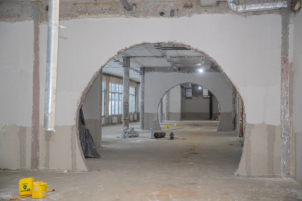 Работы идут поэтапно. Подрядчик завершил демонтаж внутри здания, на финальной стадии — устройство мягкой кровли, монтаж системы отопления и радиаторов, а также штукатурка. Наполовину разобран фасад. Строители приступили к устройству бытовой канализации, дальше — электроснабжение, вентиляция, холодное и горячее водоснабжение.