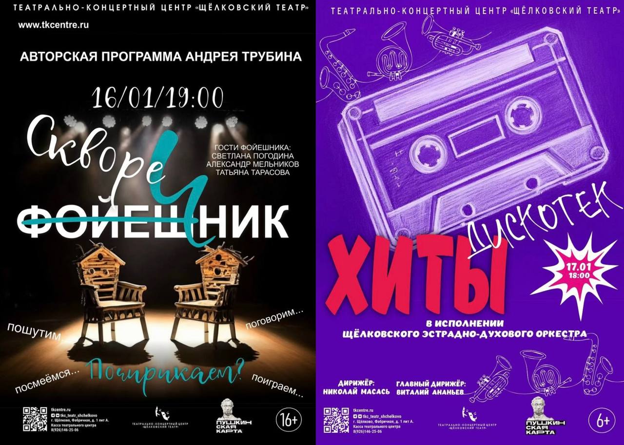 16 января, 19:00 — авторская программа Андрея Трубина «Скворечник» (16+). Вас ждут театральные сценки, музыкальные номера, увлекательные истории и много шуток — всё это в уютной атмосфере театрального фойе.