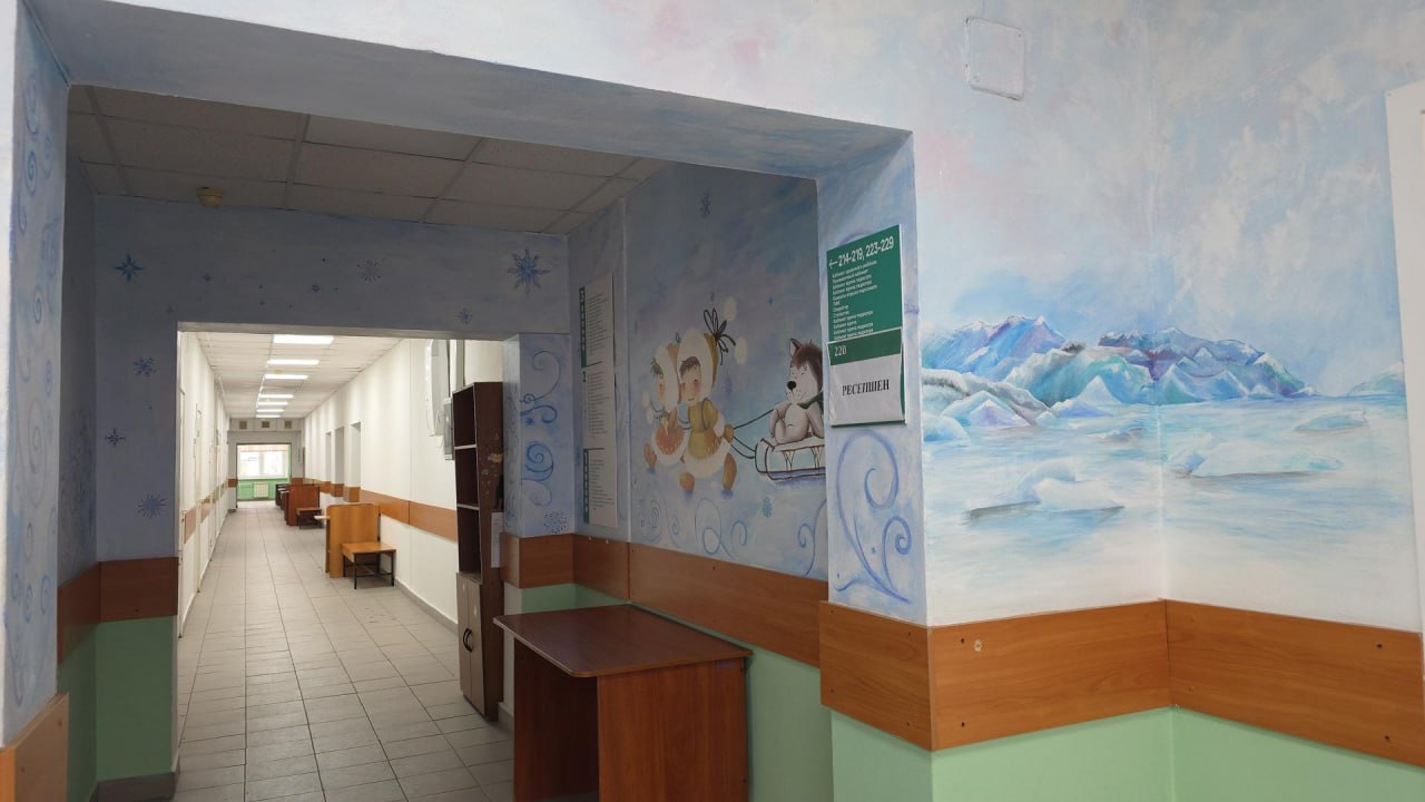 На пол уложили современную надежную плитку, стены покрасили в нежносалатовый и белый цвета. Обновили входную группу — теперь здесь новая дверь. По просьбе медперсонала поликлиники на 2-ом этаже сохранили на стенах рисунки с персонажами мультфильма «Умка», они особенно нравятся маленьким пациентам.