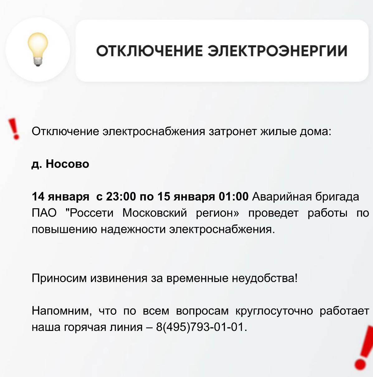 Информацию о работе ресурсоснабжающей организации можно получить по номеру горячей линии: +7 495-793-01-01.