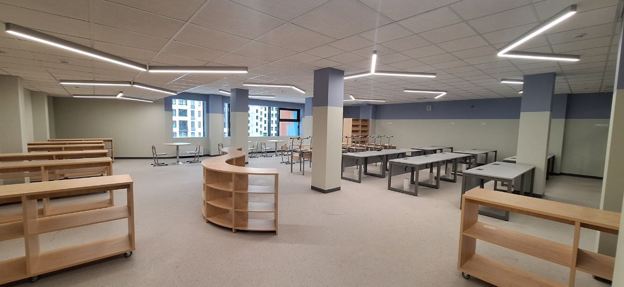 Функционирует библиотека, предусмотрены лаборантские помещения, обустроены два универсальных спортивных зала и актовый зал вместимостью 200 человек. Оборудован пищеблок и обеденный зал на 250 мест.