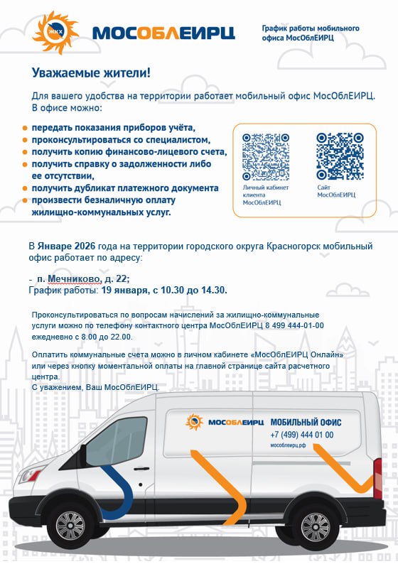 Мобильный офис МосОблЕИРЦ будет работать 19 января с 10.30 до 14.30 по адресу: п. Мечниково, д. 22.
