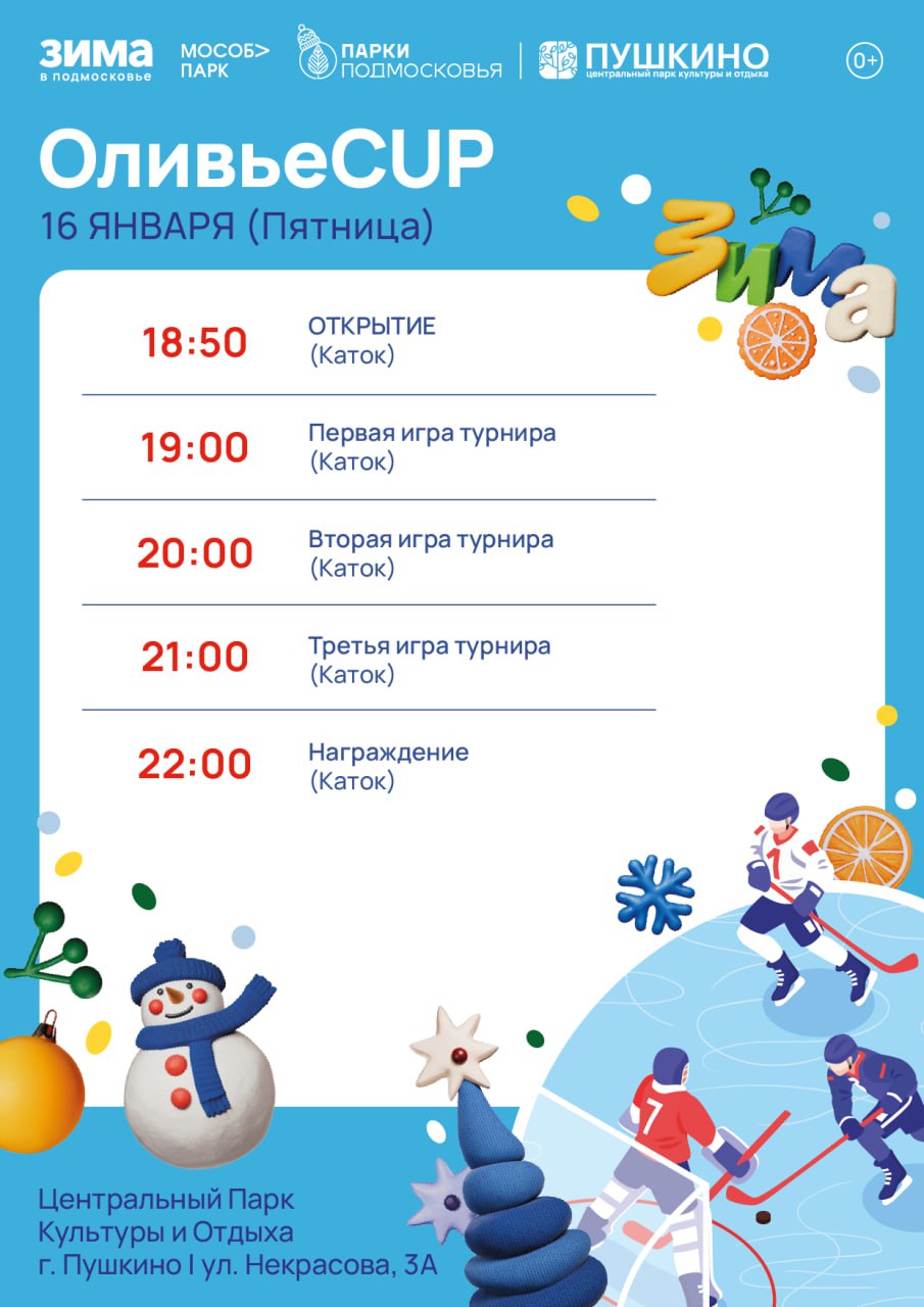 Друзья, готовьте хорошее настроение, потому что уже завтра, 16 января, на катке Центрального парка культуры и отдыха в Пушкино состоится грандиозное событие – турнир ОливьеCUP!