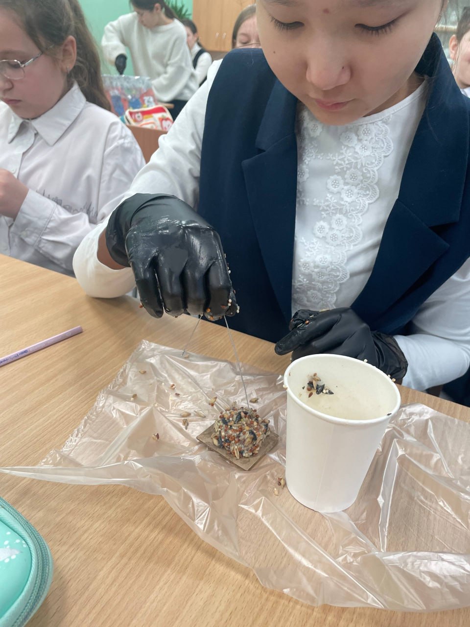 На занятиях кружка школьники узнали, что зимой, особенно в сильные морозы и снегопады, птицам необходима поддержка, ведь самим им найти пропитание в городе становится трудно. Из книг и учебников дети выяснили, что птицам полезны семена диких трав, подсолнечника, зёрна пшеницы и ячменя, а также кедровые орехи, фундук, жёлуди и засушенные ягоды рябины, боярышника или шиповника.