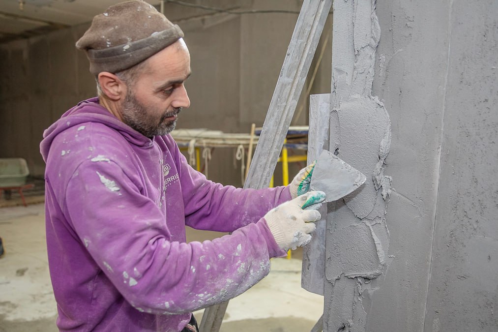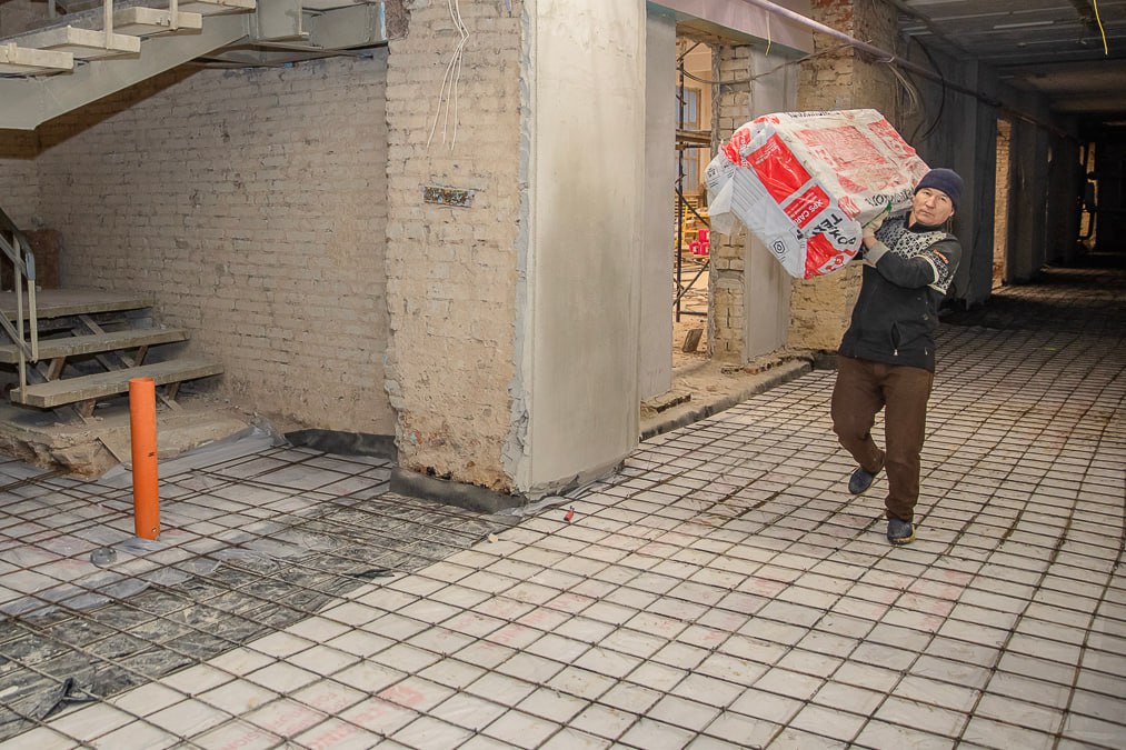 Внутри здания проложены инженерные системы. Стены оштукатурены на 85% — их выравнивают под финишную отделку. На первом этаже подготовили основание пола: сделали песчаную подушку, залили бетон, уложили утеплитель и приступили к армированию.