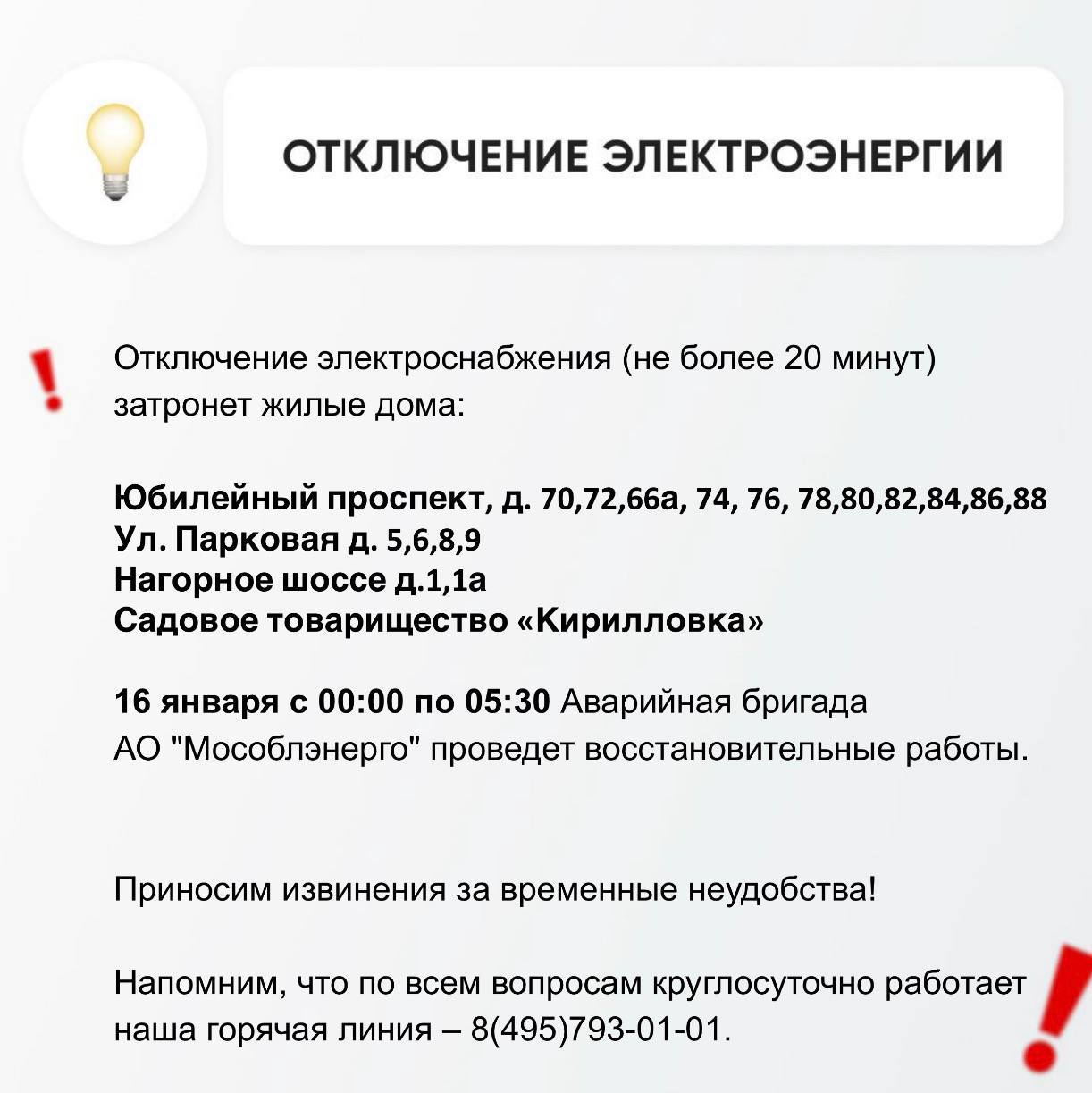 Информацию о работе ресурсоснабжающей организации можно получить по номеру горячей линии: +7 495-793-01-01.