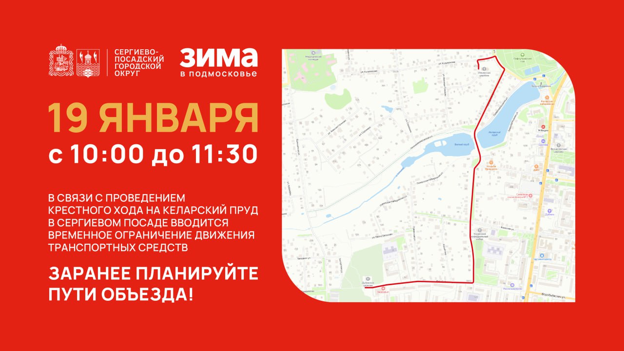 В связи с проведением Крестного хода на Келарский пруд в Сергиевом Посаде вводится временное ограничение движения транспортных средств