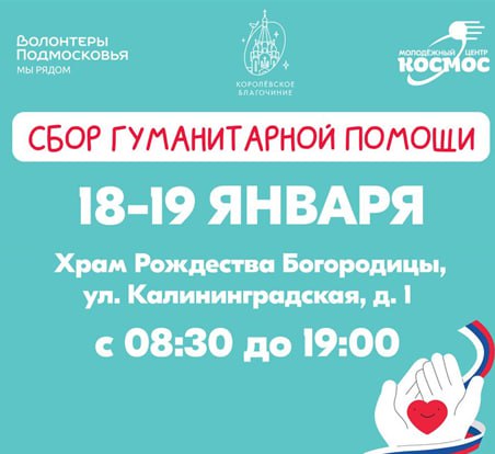 В праздничные дни Крещения, 18 и 19 января, молодежь нашего города и активисты движения "Волонтёры Подмосковья" при поддержке Королёвского благочиния проведут сбор гуманитарной помощи на территории Богородицерождественского храма в Костино. Мероприятие направлено на поддержку военнослужащих, находящихся в зоне проведения специальной военной операции.