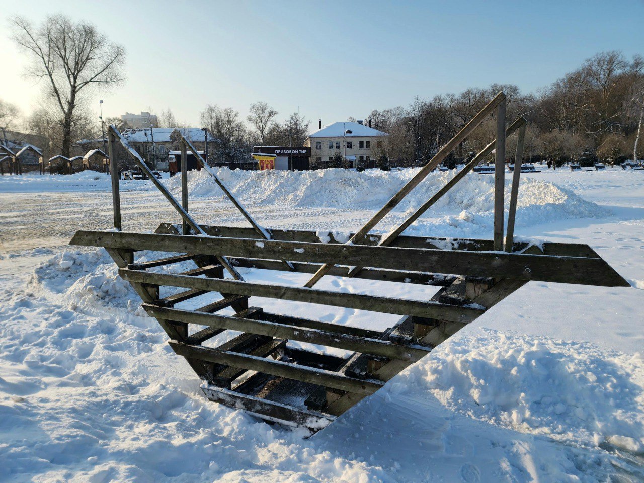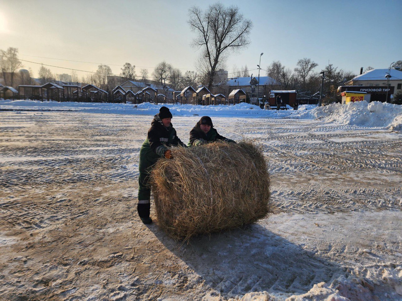 Главная локация - набережная озера Сенеж (одна из самых популярных в Подмосковье!). Сейчас там расчищают снег - на площадке, дорожках и местах для палаток и готовят сено и ступени для спуска в воду.