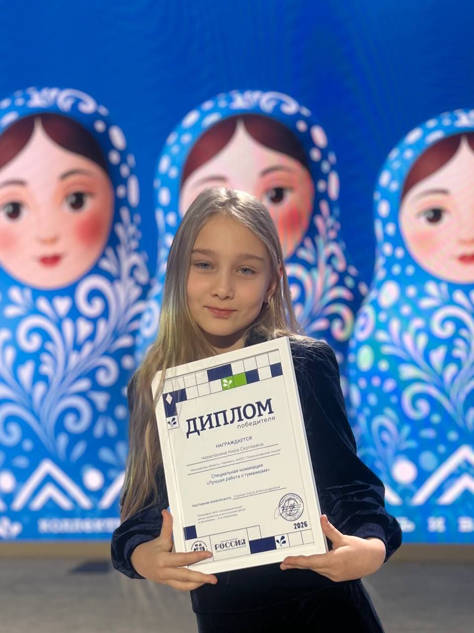 На Всероссийском конкурсе «Россия — страна традиционных ценностей» работа Киры о гуманизме была признана лучшей в специальной номинации. Конкурс был очень серьёзным. Участвовали ребята со всей России и из семи стран мира.