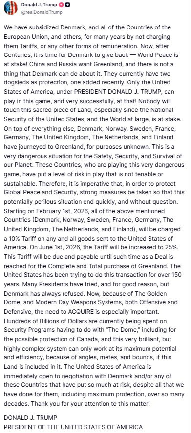 "Начиная с 1 февраля 2026 года, со всех вышеупомянутых стран (Дания, Норвегия, Швеция, Франция, Германия, Соединенное Королевство, Нидерланды и Финляндия) будет взиматься 10%-ный тариф на все товары, отправляемые в Соединенные Штаты Америки.1 июня 2026 года тариф будет увеличен до 25%"