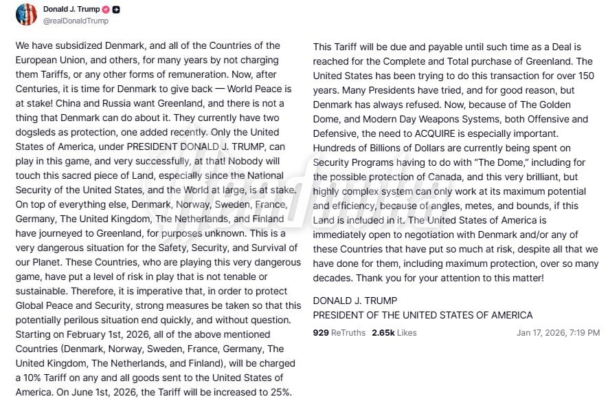 Президент США анонсировал 10% пошлины на все товары из Дании, Германии и других стран, которые отправили воинский контингент для «защиты» Гренландии от агрессии США. Штаты долгое время субсидировали все страны ЕС, в том числе северное королевство, а теперь пришло время отплатить, заявил Трамп. По его словам, Китай и Россия якобы хотят заполучить остров, и Дания не сможет его защитить. Отправку войск ЕС Трамп назвал очень опасной ситуацией для безопасности и выживания нашей планеты. С 1 февраля вводятся тарифы на товары, отправляемые в США, а с 1 июня 2026 года тариф будет увеличен до 25%.