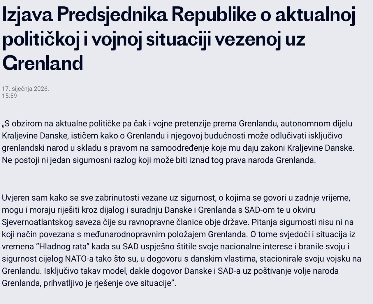 «С учётом нынешних политических, а в отдельных случаях и военных притязаний на Гренландию — автономную территорию Королевства Дания, — подчёркиваю: решения о Гренландии и её будущем может принимать исключительно гренландский народ. Не существует ни одной причины в сфере безопасности, которая могла бы стоять выше этого права народа Гренландии.