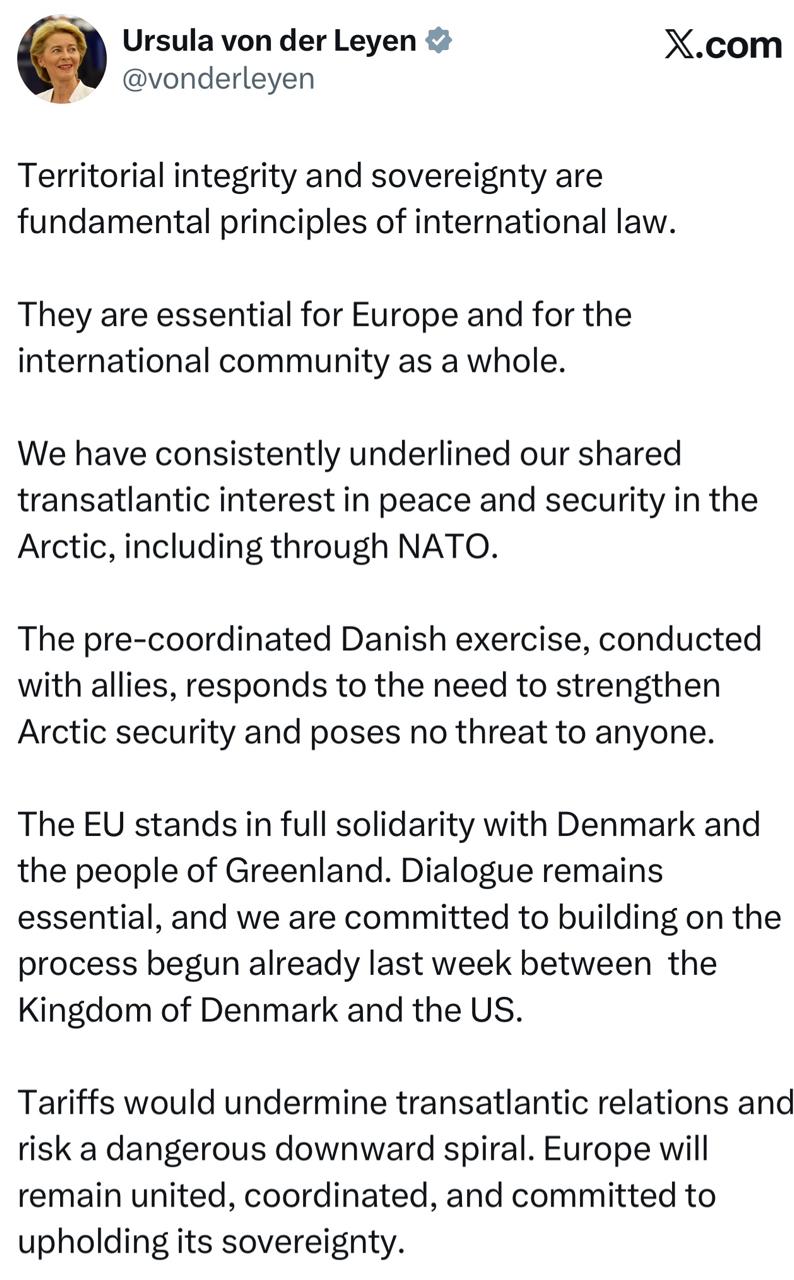 ЕС выражает полную солидарность с Данией и народом Гренландии. Диалог остается крайне важным, и мы полны решимости развивать процесс, начатый на прошлой неделе между Королевством Дания и США.
