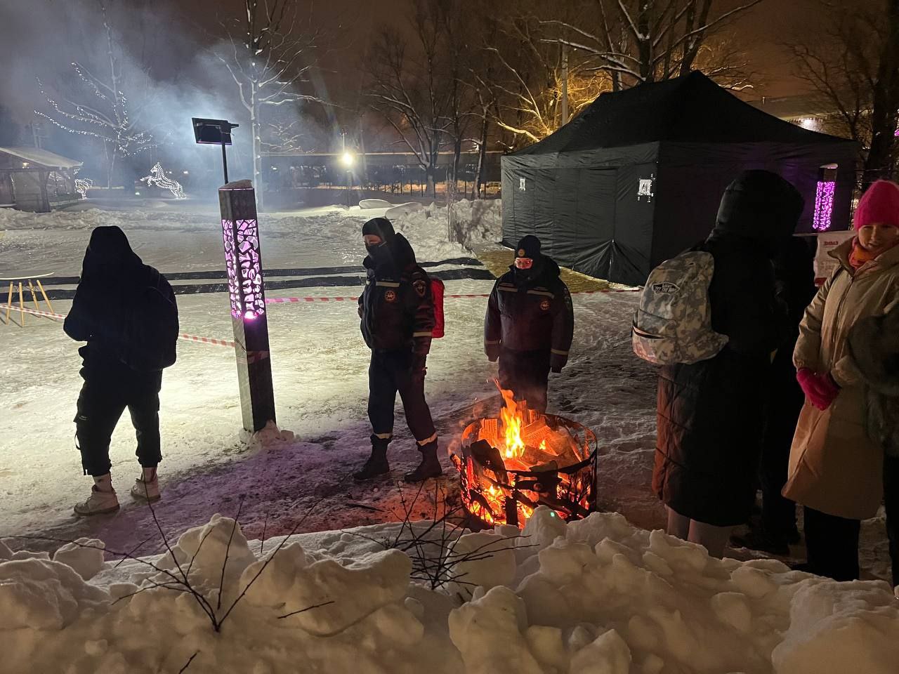 На площадке дежурят полиция, врачи, спасатели и волонтеры.