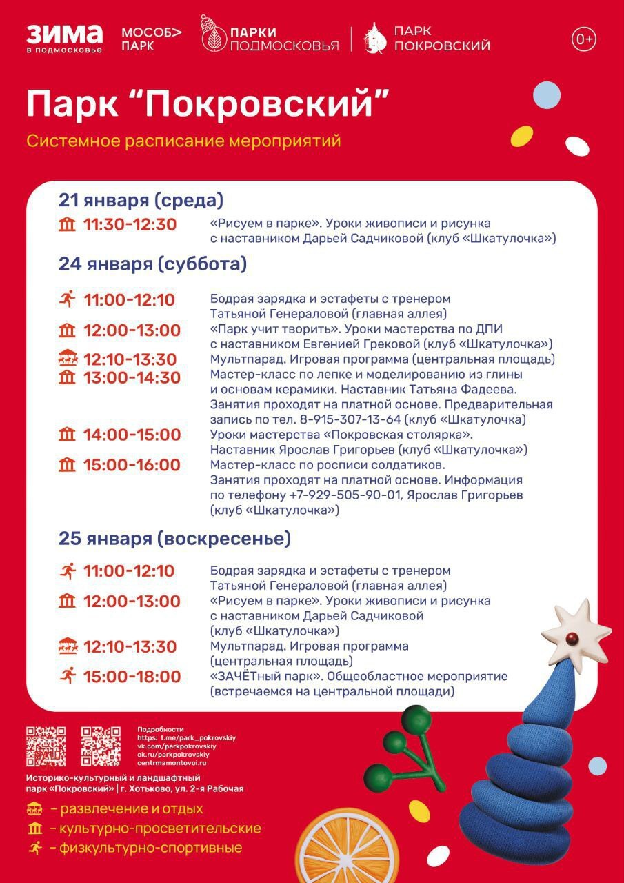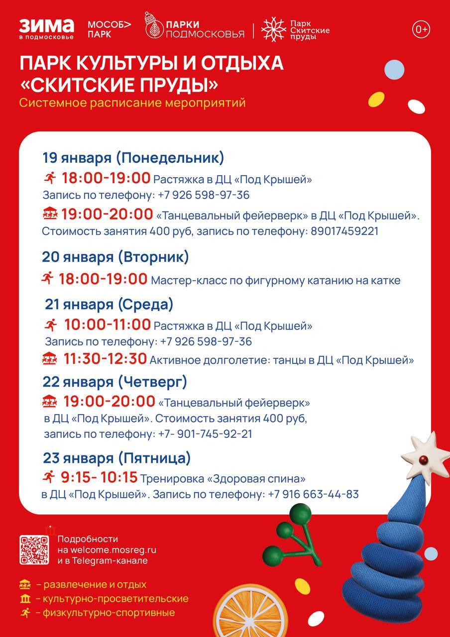 В парке «Скитские пруды» в Сергиевом Посаде пройдут мастер-класс по фигурному катанию на катке, танцы от клуба «Активное долголетие», тренировка «Здоровая спина», творческий мастер-класс, еженедельные старты «5 верст», мероприятие «Зачетный парк» и многое другое.